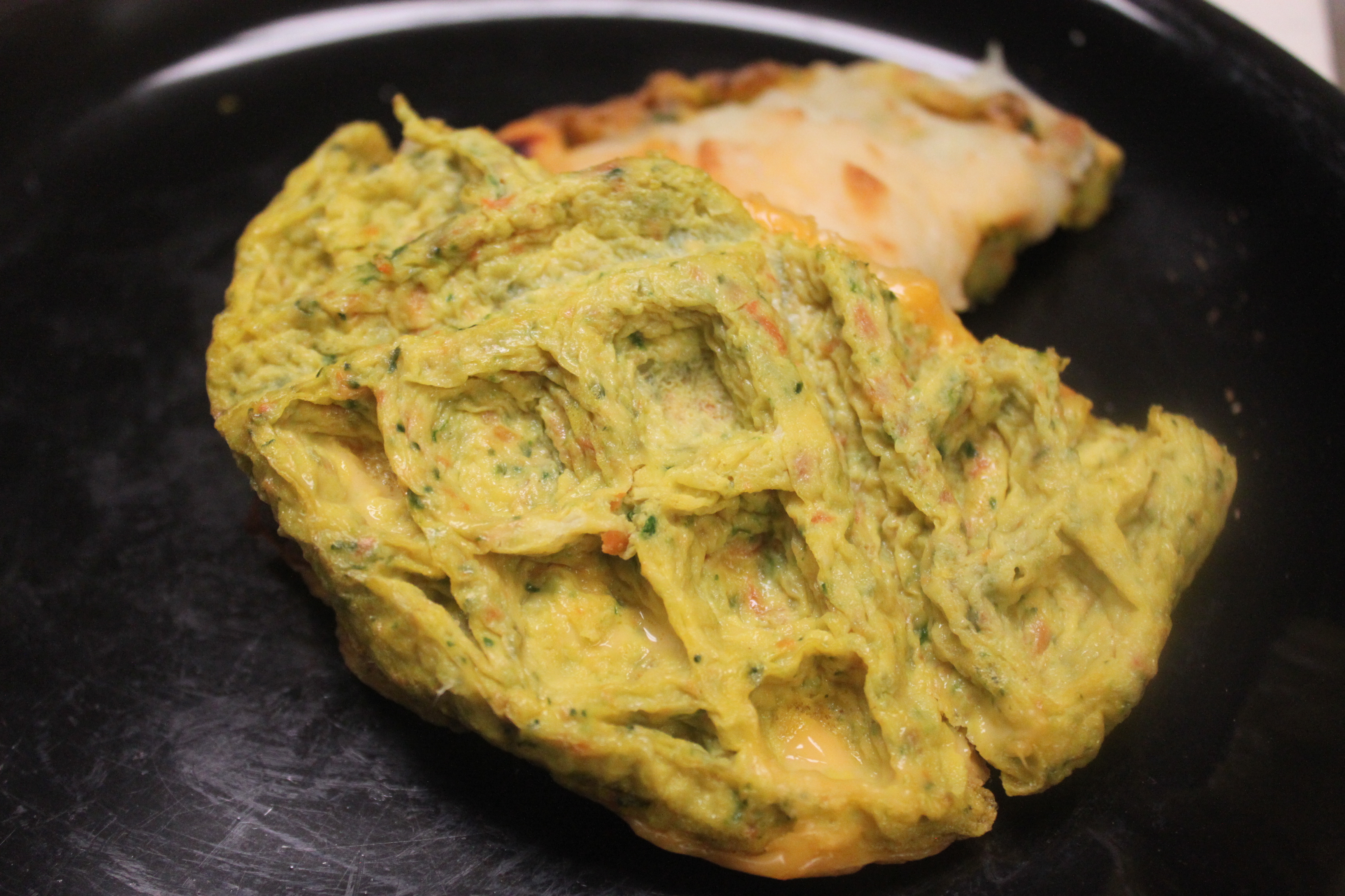 I didn’t want plain eggs, so I pulled some leftover cooked carrots, cauliflower, and broccoli out of the fridge. I proceeded to throw them in the food processor with some fresh spinach leaves as well. Then I took 10 fresh eggs from the coop and whisked the eggs and veggies together.