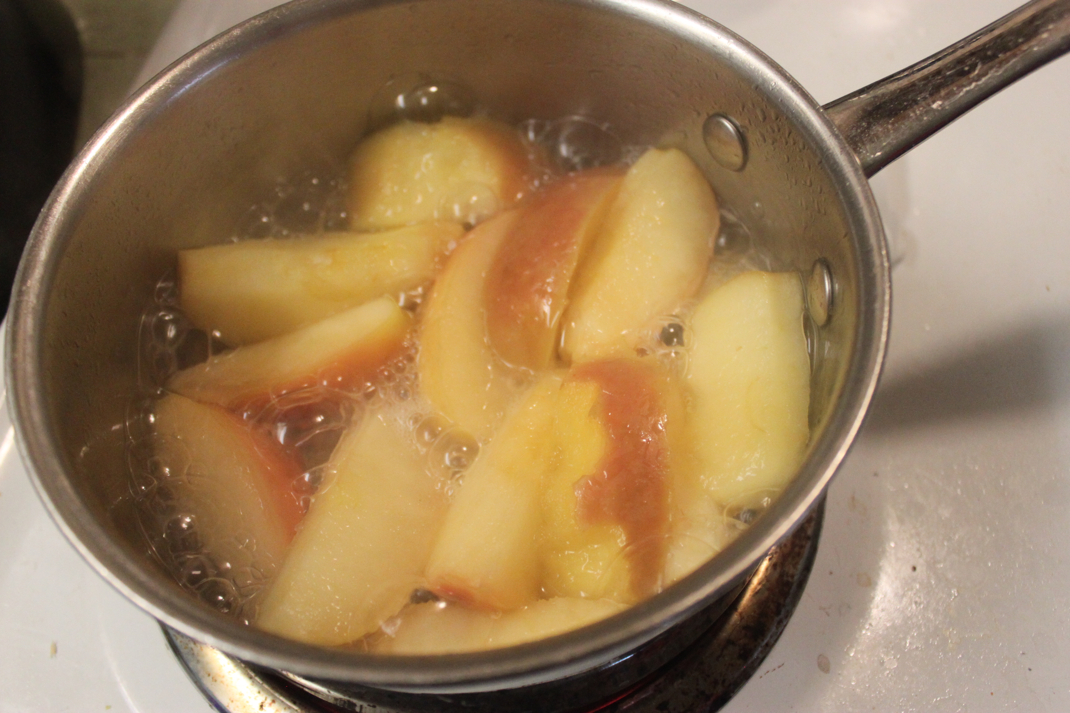 I take the apple slices and place them in a pan and cover with water and boil for 30 minutes or until soft.