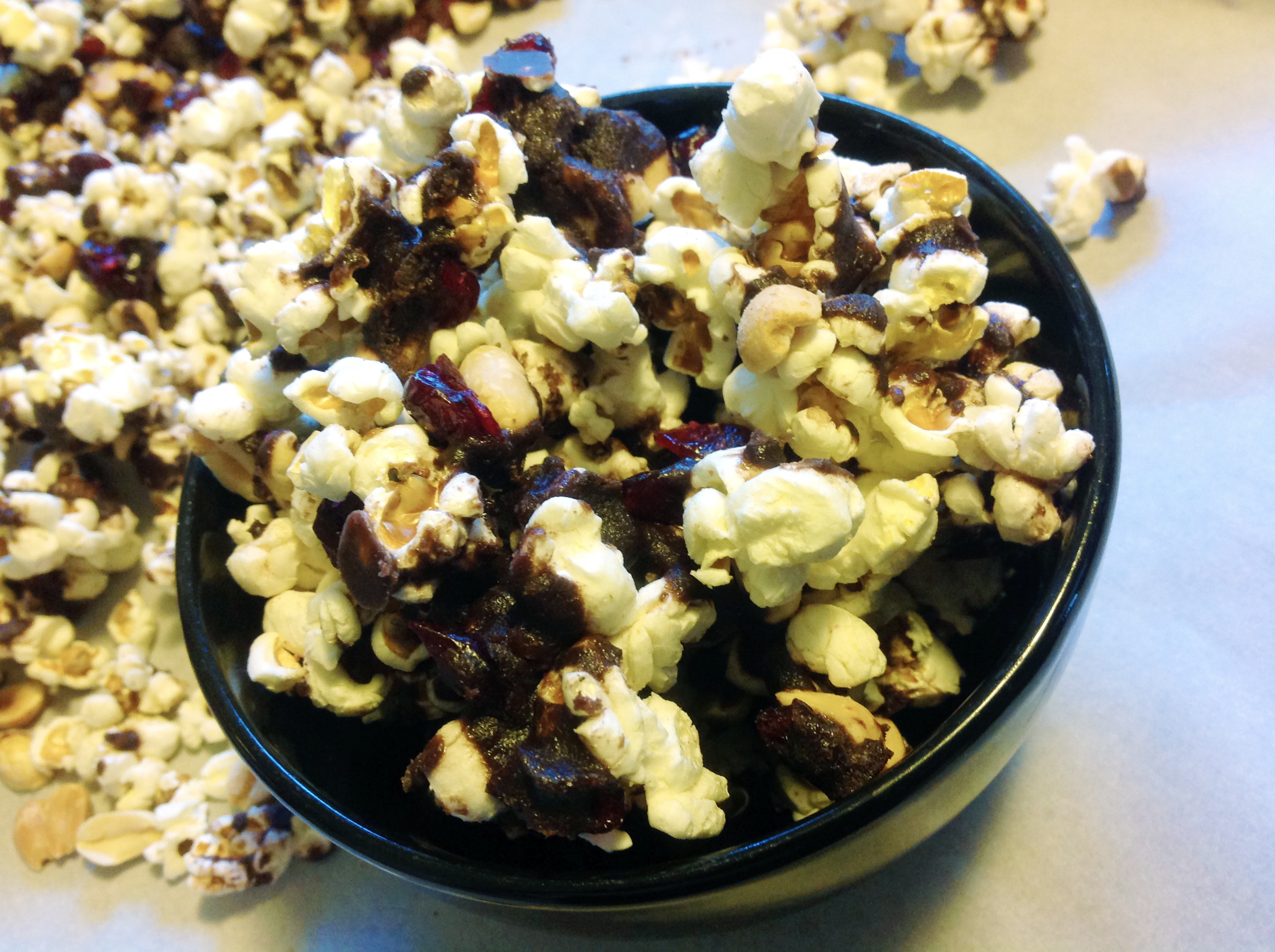 Line a baking sheets with parchment paper. Fill the baking sheet with popcorn. Sprinkle with desired amount of dried cranberries and peanuts.